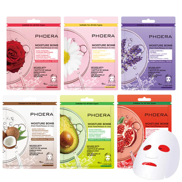 Mască facială antioxidantă și iluminatoare cu rodie: Conține extract de rodie, care poate oferi o hidratare abundentă și aduce o hidratare perfectă pielii, are efect antioxidant și face pielea strălucitoare.